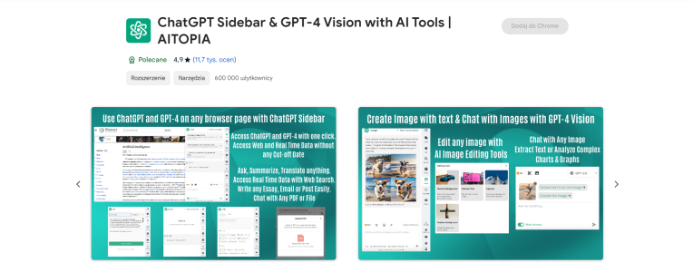 Pełna nazwa rozszerzenia stworzonego przez firmę AITOPIA to ChatGPT Sidebar & GPT-4 Vision with AI Tools. Posiada ono ocenę 4,9 gwiazdek na 5 możliwych i zostało już użyte przez około 600 000 użytkowników. Rozszerzenie posiada również odznakę rozszerzenia polecanego przez Chrome Web Store. Narzędzie to zostało zaprojektowane tak, aby pomagać w generowaniu odpowiedzi i obrazów AI, a także podsumowywaniu i analizowaniu stron internetowych bez konieczności otwierania innej karty. Dzięki poręcznemu paskowi bocznemu przyklejonemu do okna przeglądarki możesz mieć dostęp do wielu rozwiązań, a wśród nich: