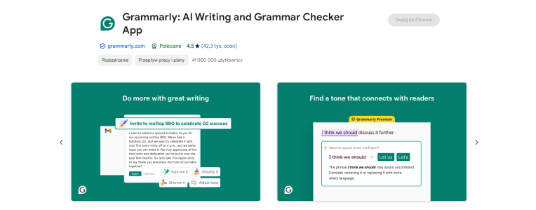 Grammarly: AI Writing and Grammar Checker App to kolejne polecane rozszerzenie, które może pomóc twórcom treści. Ocenione ono zostało na 4,5 gwiazdki, a użyło go około 40 000 000 użytkowników. Po aktywacji rozszerzenie pomaga w sprawdzaniu pisowni, gramatyki, interpunkcji i nie tylko – niezależnie od tego, czy korzystasz z dokumentów Google, Gmaila czy mediów społecznościowych. Ponadto dzięki narzędziu wspieranym sztuczną inteligencją możesz na przykład przeformułować swoje teksty. Możesz korzystać z rozszerzenia Grammarly za darmo, jednak nie otrzymasz dostępu do zaawansowanych opcji, takich jak sugestie dotyczące tonu lub płynności, a także do większej ilości podpowiedzi AI (w wersji podstawowej jest ich około 100).