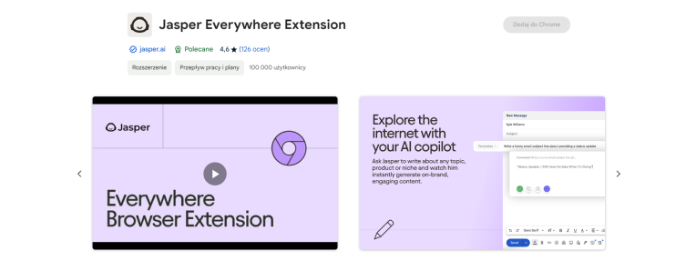 Rozszerzenie Jasper Everywhere Extension w sklepie Chrome Web Store otrzymało ocenę 4,6 gwiazdki. Jest oznaczone jako produkt polecany i użyte zostało przez około 100 000 użytkowników. To dobry wybór, jeśli szukasz pomocy w pisaniu wspieranym przez AI, które ułatwi przeformułowywanie i wykorzystywanie Twoich tekstów dla różnych mediów, zmieniając ich ton i długość. Działa w dokumentach Google, a także platformach takich jak WordPress, Gmail, Canva itd. Możesz zacząć używać rozszerzenia Jasper od 7-dniowego bezpłatnego okresu próbnego, po którego zakończeniu konieczne będzie kupienie subskrypcji. Jeśli chcesz używać go na jednym urządzeniu, możesz wybrać plan Creator za około 1 800 PLN rocznie. W wersji Pro maksymalnie 5 użytkowników może korzystać z narzędzia, za subskrypcję dla każdego z nich zapłacić trzeba będzie około 2 700 PLN rocznie. Będziesz również mógł korzystać z takich funkcji, jak generowanie obrazów AI. Jeśli potrzebujesz asystenta pisania dla więcej niż 5 osób, będziesz musiał zasubskrybować plan Business, jednak aby poznać jego cenę i uzyskać spersonalizowane funkcje, konieczne będzie skontaktowanie się z zespołem Jasper.