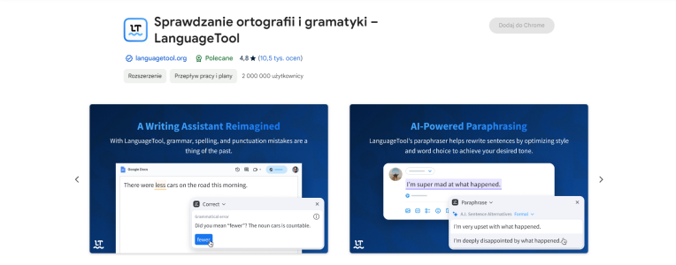 Sprawdzanie ortografii i gramatyki – LanguageTool to polecane rozszerzenie z oceną 4,8 gwiazdek i 2 000 000 użytkownikami. W przeciwieństwie do dwóch wyżej opisanych (Jasper i Grammarly) narzędzie to jest całkowicie darmowe! Pomoże Ci znaleźć błędy w pisowni i dostosować styl tekstu. AI Grammar Checker będzie działać na wielu platformach, takich jak dokumenty Google i Gmail, ale także w mediach społecznościowych, takich jak LinkedIn. Za tym rozszerzeniem przemawia fakt, że działa ono w ponad 25 językach: angielski (Australia, Kanada, Wielka Brytania, Nowa Zelandia, Republika Południowej Afryki, Stany Zjednoczone), arabski, asturyjski, białoruski, bretoński, chiński, duński, esperanto, francuski, galicyjski, grecki, hiszpański, holenderski, japoński, kataloński (również walencki), khmerski, niemiecki (Austria, Niemcy, Szwajcaria), perski, polski, portugalski (Brazylia, Portugalia, Angola, Mozambik), rosyjski, rumuński, słowacki, słoweński, szwedzki, tagalski, tamilski, ukraiński i włoski.