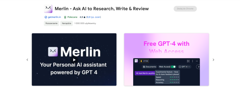 Merlin – Ask AI to Research, Write & Review to polecane rozszerzenie o ocenie 4,8 gwiazdek i 1 000 000 bazie użytkowników. Narzędzie to zostało stworzone do pomocy w podsumowaniu treści (ze stron internetowych, prac naukowych i filmów z YouTube) i w ich tworzeniu (np. artykułów blogowych lub tekstów reklamowych). Co ważne, rozszerzenie Merlin opracowano na modelu API narzędzia ChatGPT. W wersji bezpłatnej otrzymujesz 102 bezpłatne zapytania każdego dnia. Jeśli chcesz rozszerzyć swój dostęp, możesz subskrybować narzędzie za około 700 PLN rocznie za pięć lub więcej miejsc (w planie Teams). Istnieje również plan Pro, który kosztuje około 880 PLN rocznie, w którym możesz uzyskać dostęp do nieograniczonego generowania grafik oraz nieograniczonej liczby zapytań. Odpowiedzi wygenerowane będą przy użyciu przodujących systemów AI, takich jak GPT-4 lub Mistral Large.